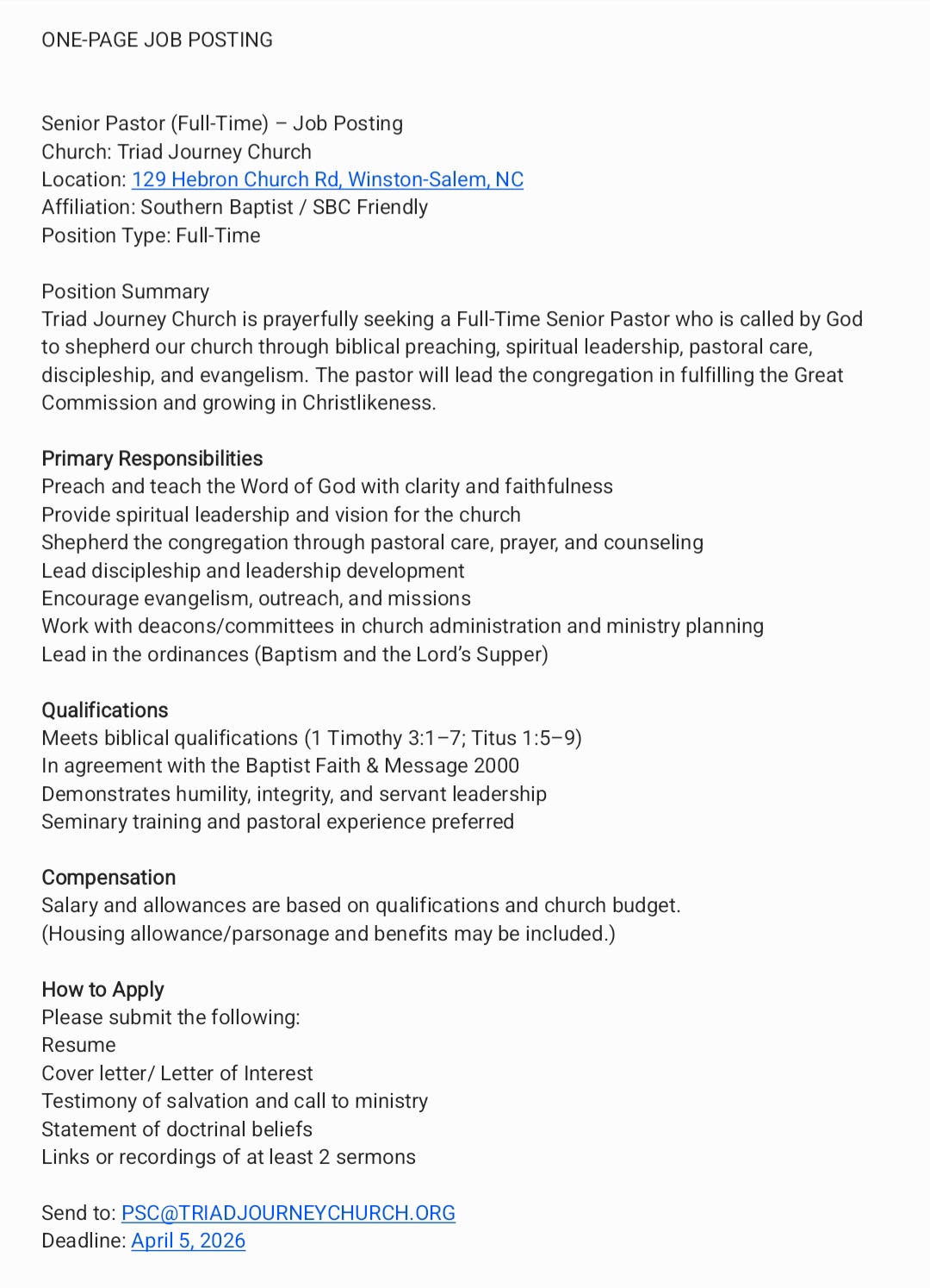 Triad Journey Church is seeking a Bi-Vocational Pastor. Send resume or any questions to